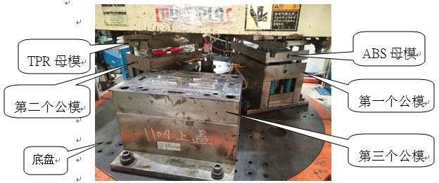 在机台上只要一副模具,上半边出产ABS,下半边出产TPR.母模部分固定不动.模具的公模部分内部能够旋转180度.
