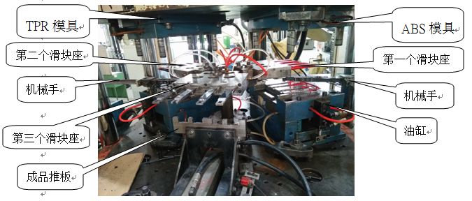 在机台上有两副模具,一副出产ABS,别的一副出产TPR.母模部分固定不动.公模部分随机台大圆盘能够旋转180度.人侧注入TPR,非人侧注入ABS.