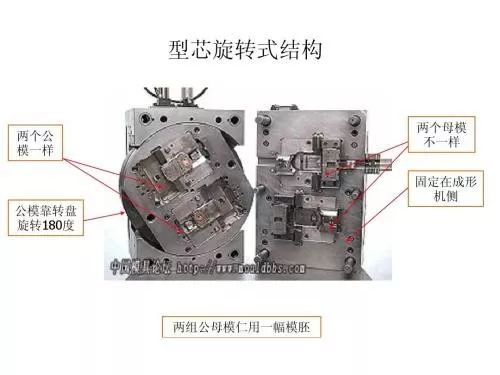 阐明:以下图片为中国模具论坛所运用,为上下结构型芯旋转连体式模具.连体式有公母模上下结构与左右结构.