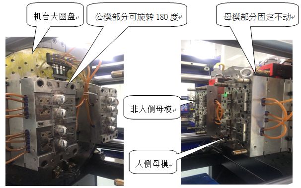 2. 模具翻开,非人侧出产完ABS产品的公模部分随机台大圆盘逆时针旋转180度至人侧母模相对方位,而人侧公模部分随机台大圆盘逆时针旋转180度至非人侧母模相对方位.