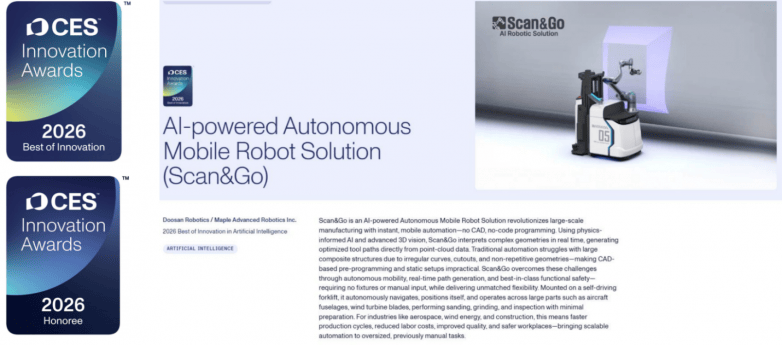 2026 年国际消费电子展(CES)的聚光灯聚集拉斯维加斯会展中心,工业机器人 AI 范畴诞生焦点时间 —— 源自和意精工的 AARS(自主自习惯机器人体系)技能,携手协作伙伴斗山机器人(Doosan Robotics),一举斩获 CES 2026 “人工智能” 类别 “最佳立异” 奖,一起当选 “机器人” 类别立异奖荣誉名单,成为本届 CES 唯一在双中心赛道获奖的工业机器人智能化技能!